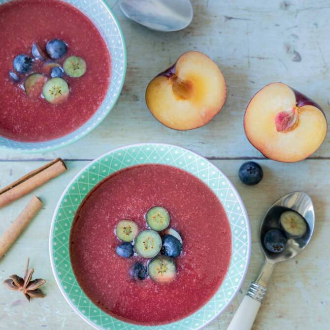 What is the most refreshing dessert when the sun is beating down? A cold fruit soup! We have the perfect vegan recipe with plums and blueberries.