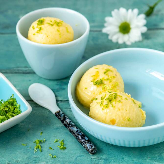 Divide the frozen yoghurt between small bowls, sprinkle the grated lime peel on top and enjoy immediately.
