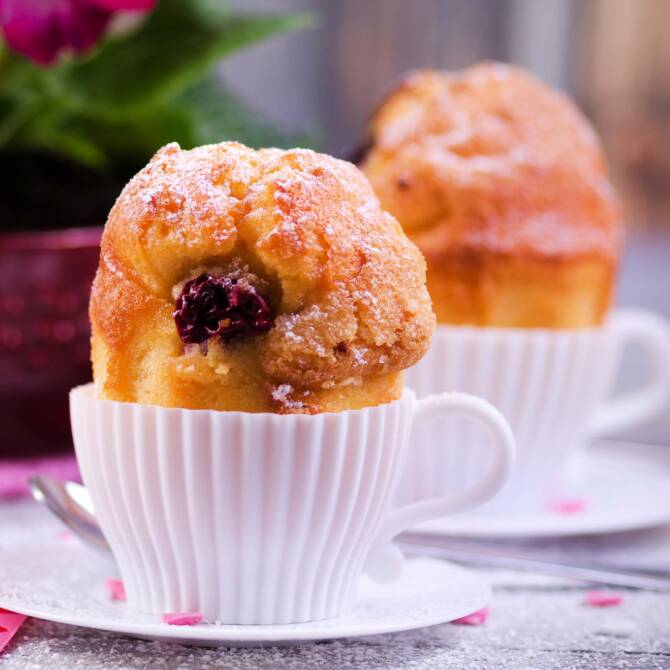 Beat together the egg, SteviaSweet Crystal and soft butter until the mixture is fluffy. Slowly mix in the flour with the baking powder and stir in the milk, a little at a time. The batter must be runny enough that it can easily fill the moulds. Finally, add the whole frozen berries. If the berries are crushed, this will change the colour of the batter. Place the paper moulds into the muffin tray and fill with the prepared batter so that the moulds are nicely filled. Bake for 20-30 minutes in the middle of a preheated oven at 200 °C until the muffins are beautifully golden brown.