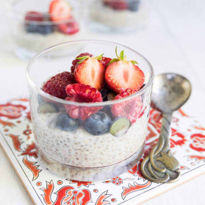 Mix the lime juice, lime peel, vanilla and SteviaSweet Liquid with the almond milk. Add the yogurt and chia seeds and mix so that the seeds don’t stick together. Leave the pudding to set in a cool place for at least half an hour or overnight. Serve with fresh berries. Enjoy.