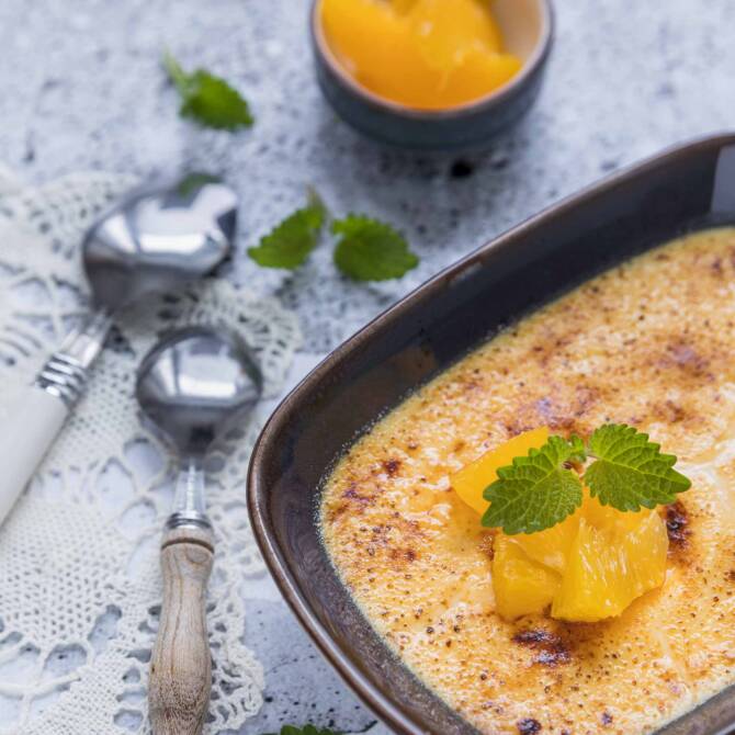 Die klassische Crème Brûlée, verfeinert mit Orangen. Zum dahin schmelzen. Und ganz ohne Zucker!