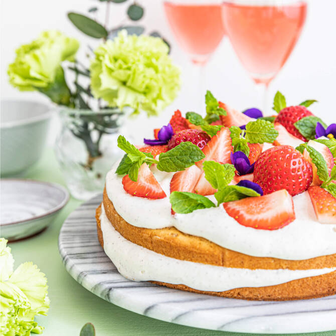 - Auf die obere Platte ebenfalls Quarkmischung auftragen, aber nicht auf die Ränder geben. Direkt vor dem Servieren mit Erdbeeren, Minzblättchen und essbaren Blüten dekorieren.