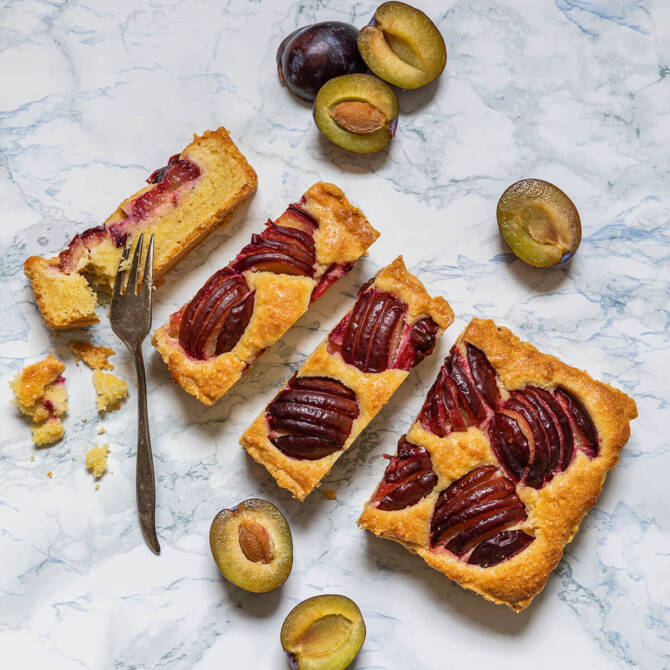 Pflaumen sind leicht bekömmlich, stärken die Nerven und schmecken am besten mitten in einem lauwarmen, zuckerfreien Mandelkuchen.