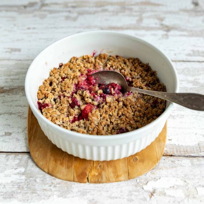 - Butter und die Zutaten für den Belag zu einer groben Mischung verrühren. Auf den Beeren verteilen.