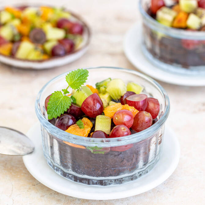 Schokoladen-Lavacake mit Obstsalat, zuckerfrei