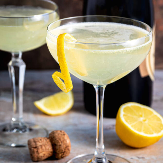 4. Schütteln und in Sektgläser filtern. Mit Sekt aufgiessen und mit Zitronenschale dekorieren.